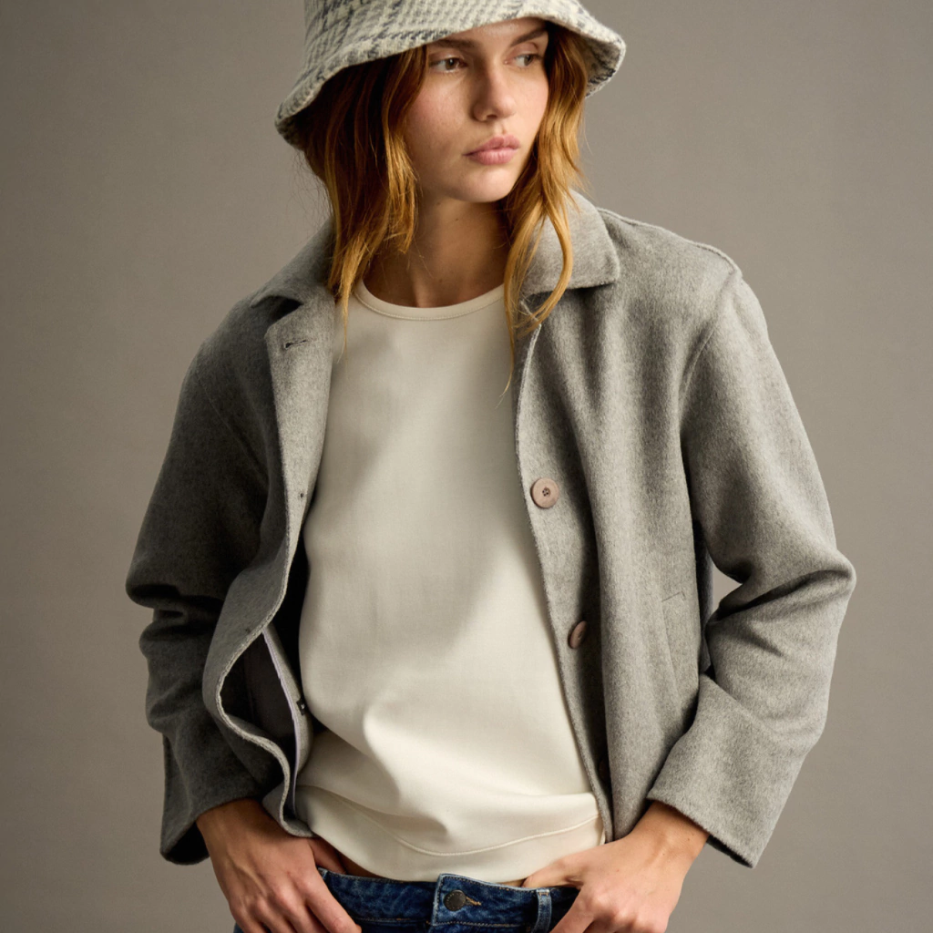 - Prenda confeccionada con un tejido doble faz, con terminaciones realizadas a mano.