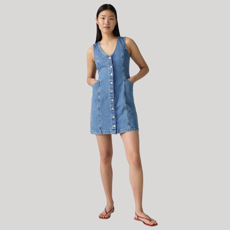 Este vestido de jean para mujer combina estilo casual y versatilidad. Confeccionado en denim azul clásico, presenta diseño sin mangas, escote en V favorecedor y cierre con botones metálicos al frente que le dan un toque moderno. Su corte ajustado en la cintura y ligeramente evasé hacia el ruedo realzan la silueta, mientras que la parte trasera incluye costuras de entalle y hebilla decorativa para mejor calce.